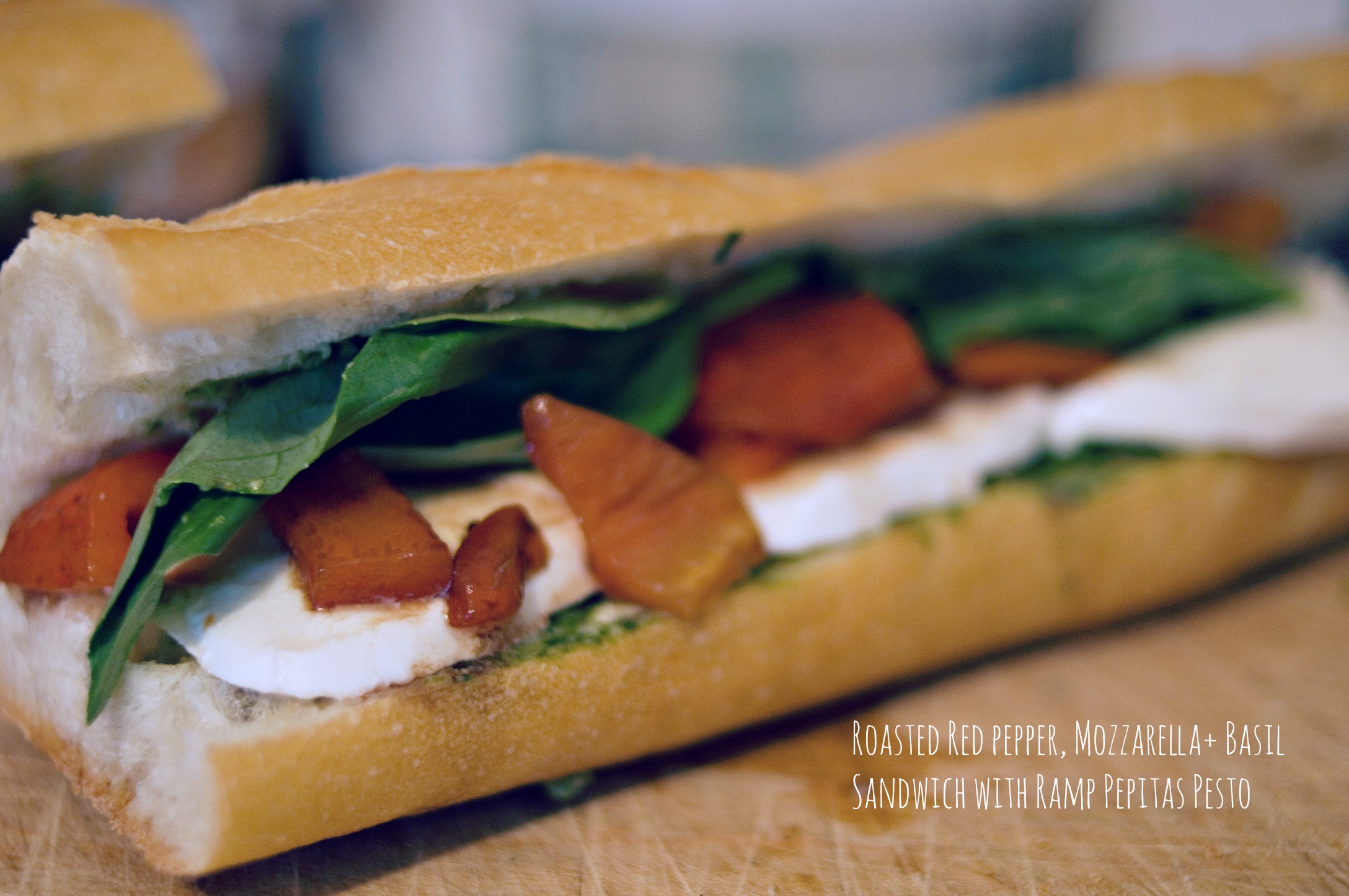 Mozzarella, Roasted Red Pepper and Basil Sandwich with Ramp Pepitas Pesto