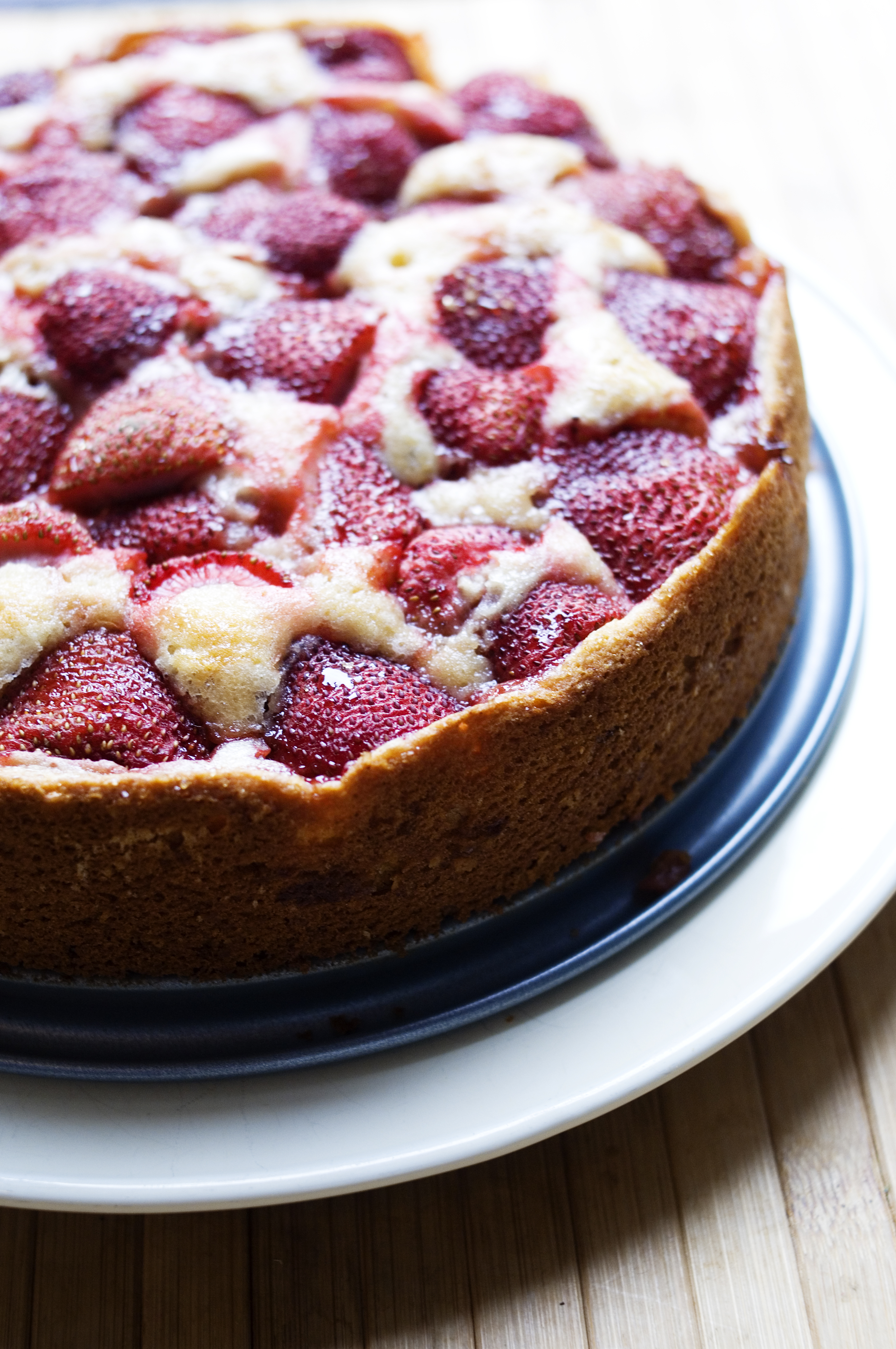 Pour into prepared pan. Arrange strawberries, cut side down, on top of batter, as closely as possible in a single layer. You may need to overlap them to get all of them on the batter. Sprinkle 2 tablespoons of turbinado sugar over berries.