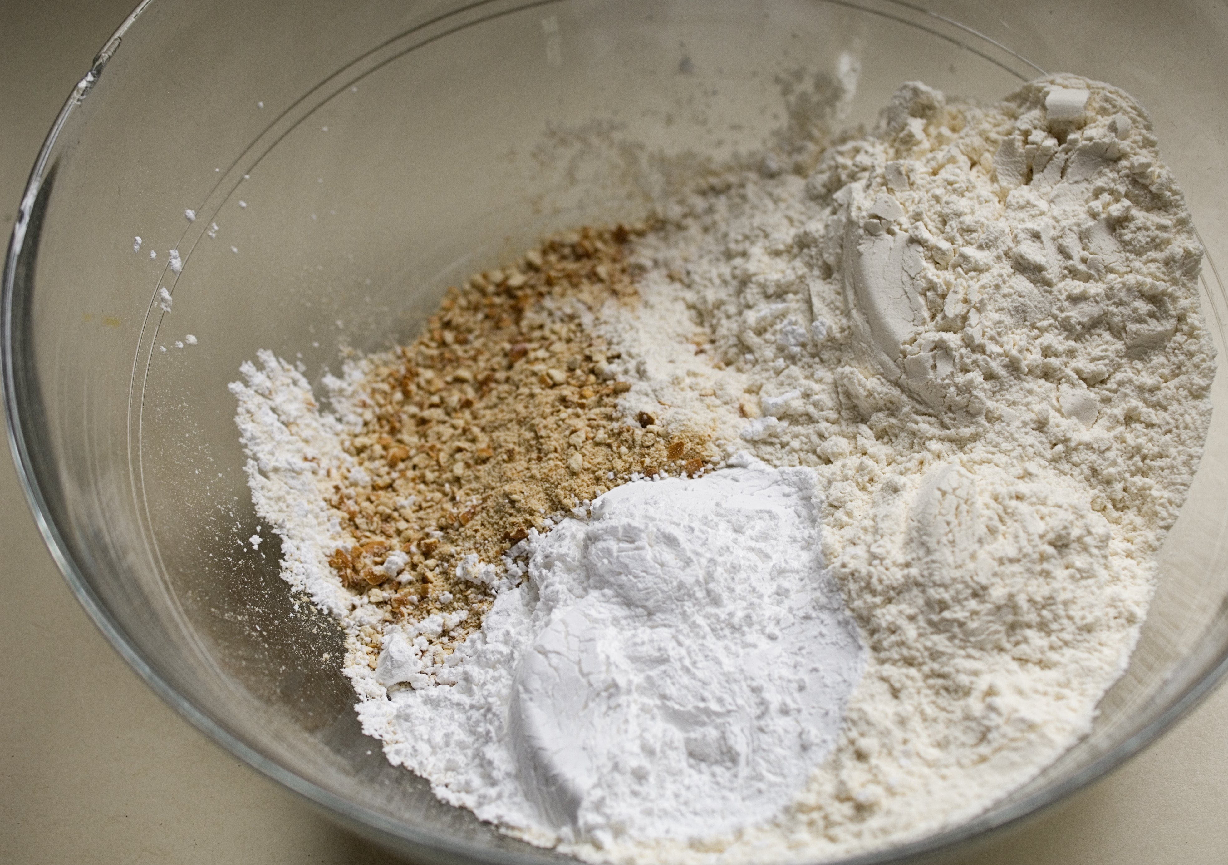 Whisk together flour, crushed Rold Gold Pretzels (a peanut free brand) and confectioners sugar in a large bowl. Add browned butter and combined with your fingers until moist.