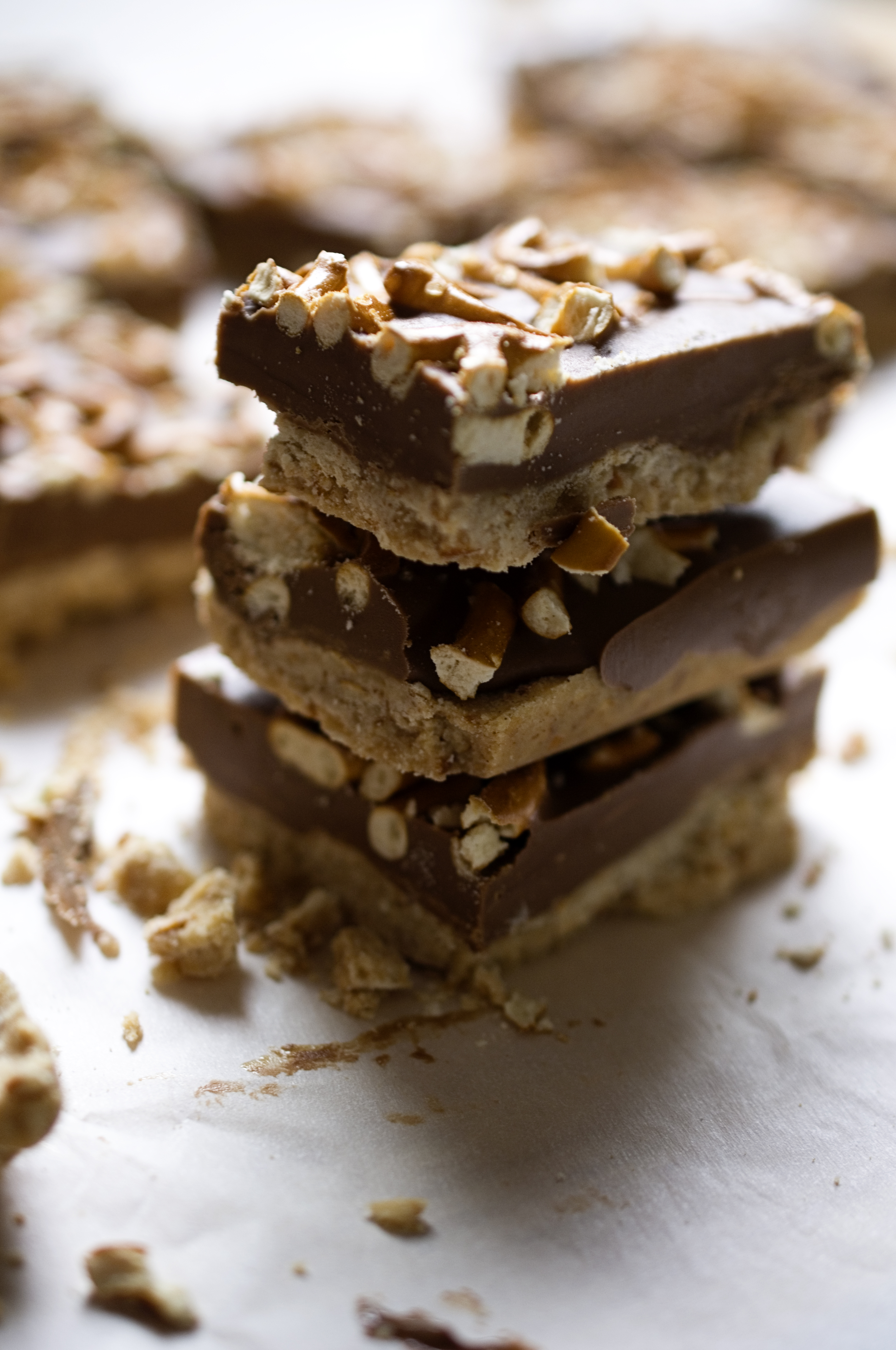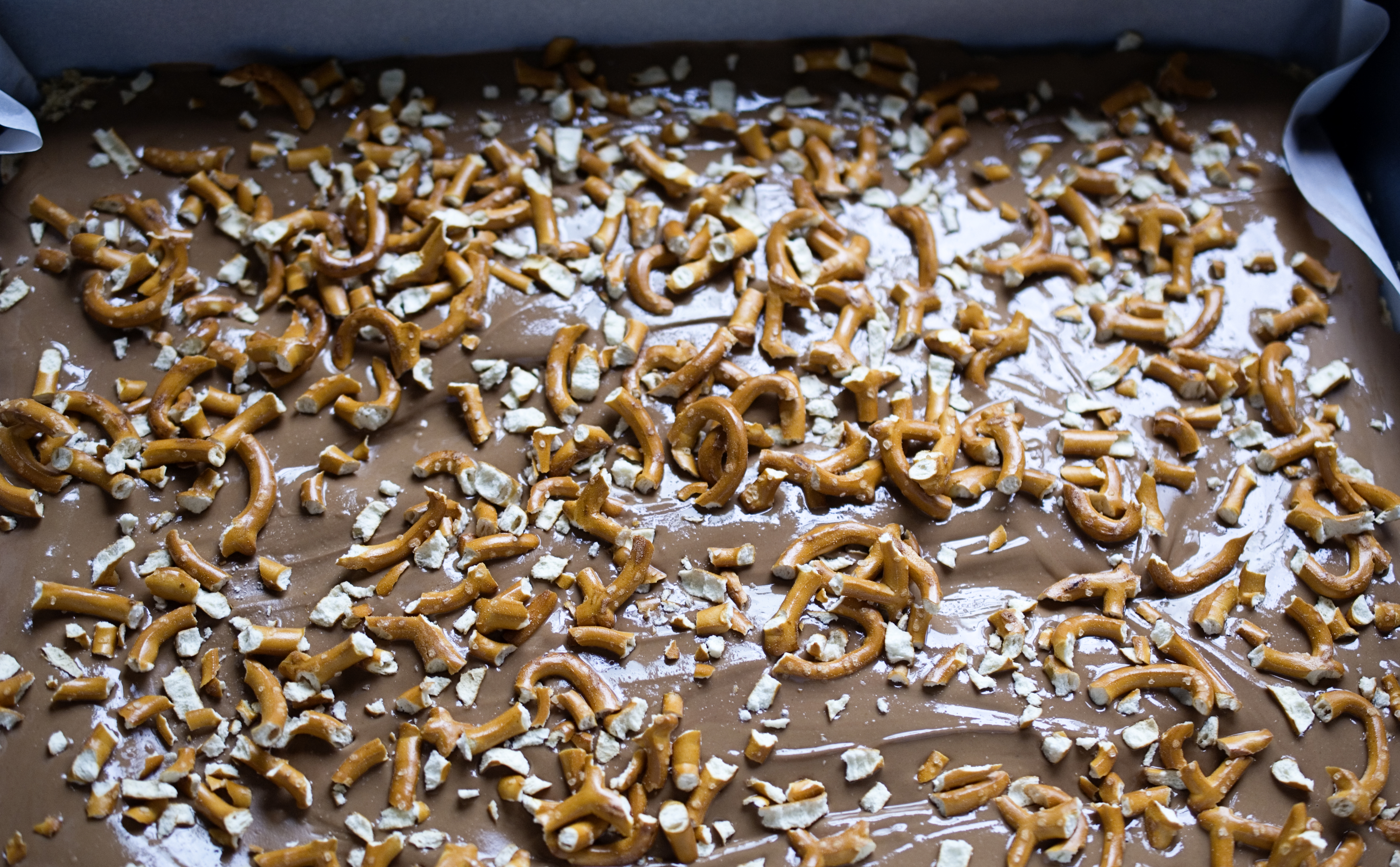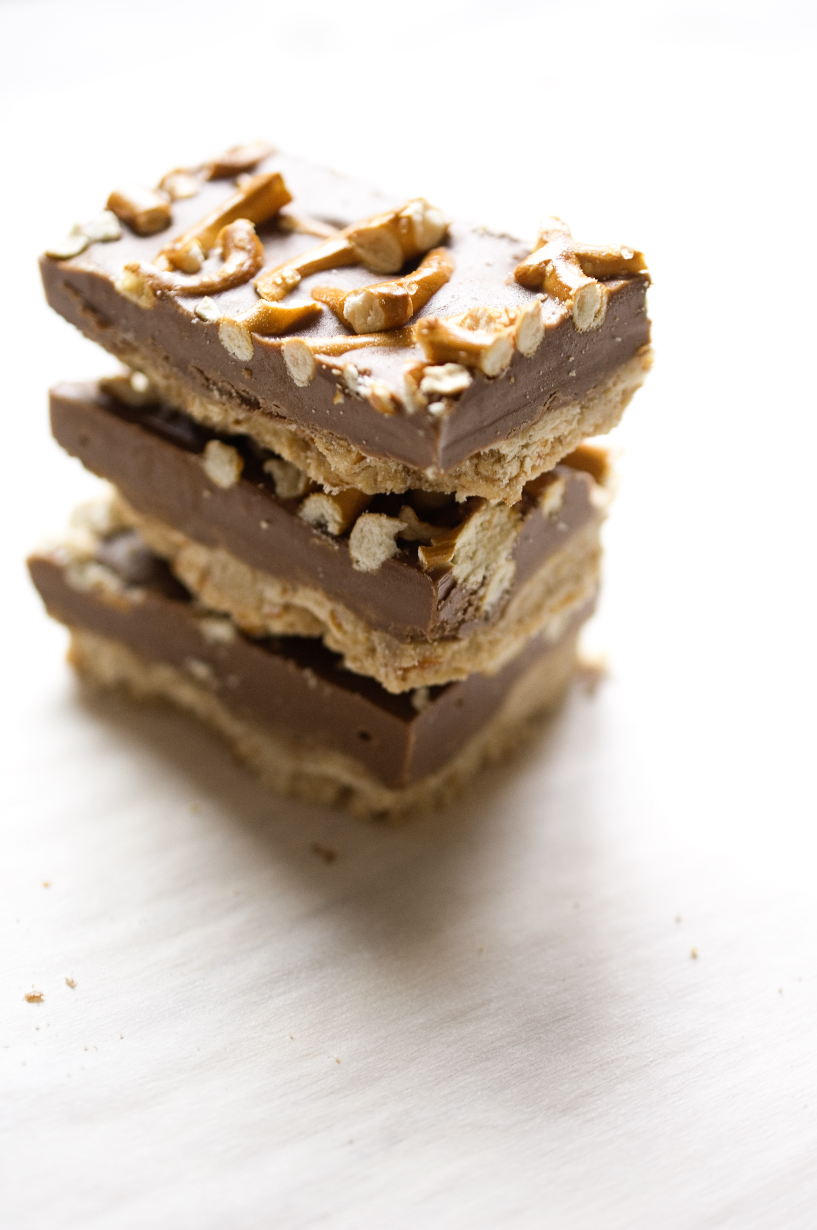 Remove crust from the oven. Pour the chocolate mixture over the crust and spread evenly. Sprinkle with crushed pretzels and press the pretzels gently into the chocolate mixture. Pop into the freezer and chill for 1 hour. Remove from freezer and cut into squares. You can serve them frozen, chilled or at room temperature. I liked them chilled but any temperature will work and taste great!