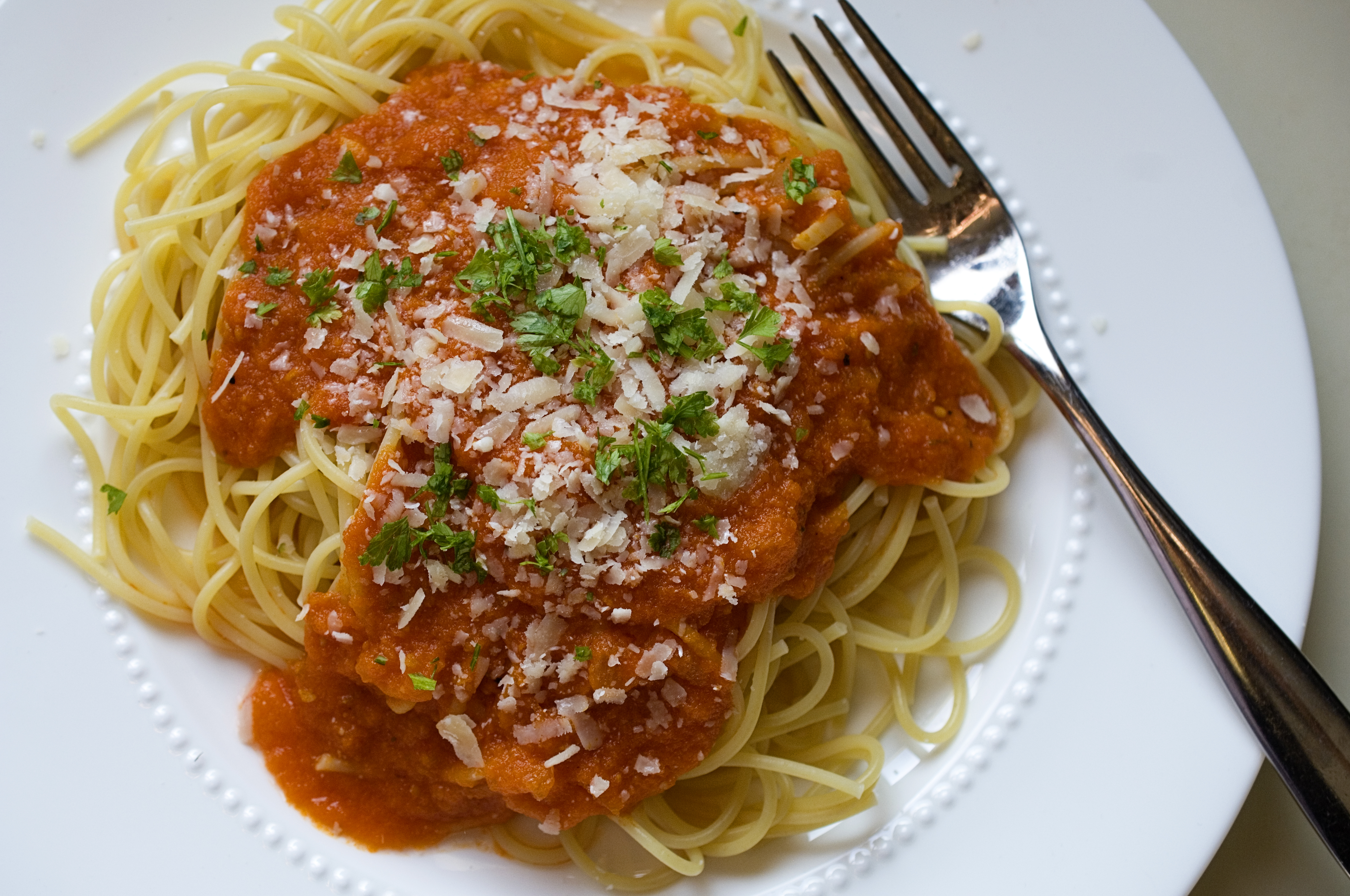 Serve over spaghetti with lots of parmesan cheese and a bit of chopped parsley or basil. Enjoy!