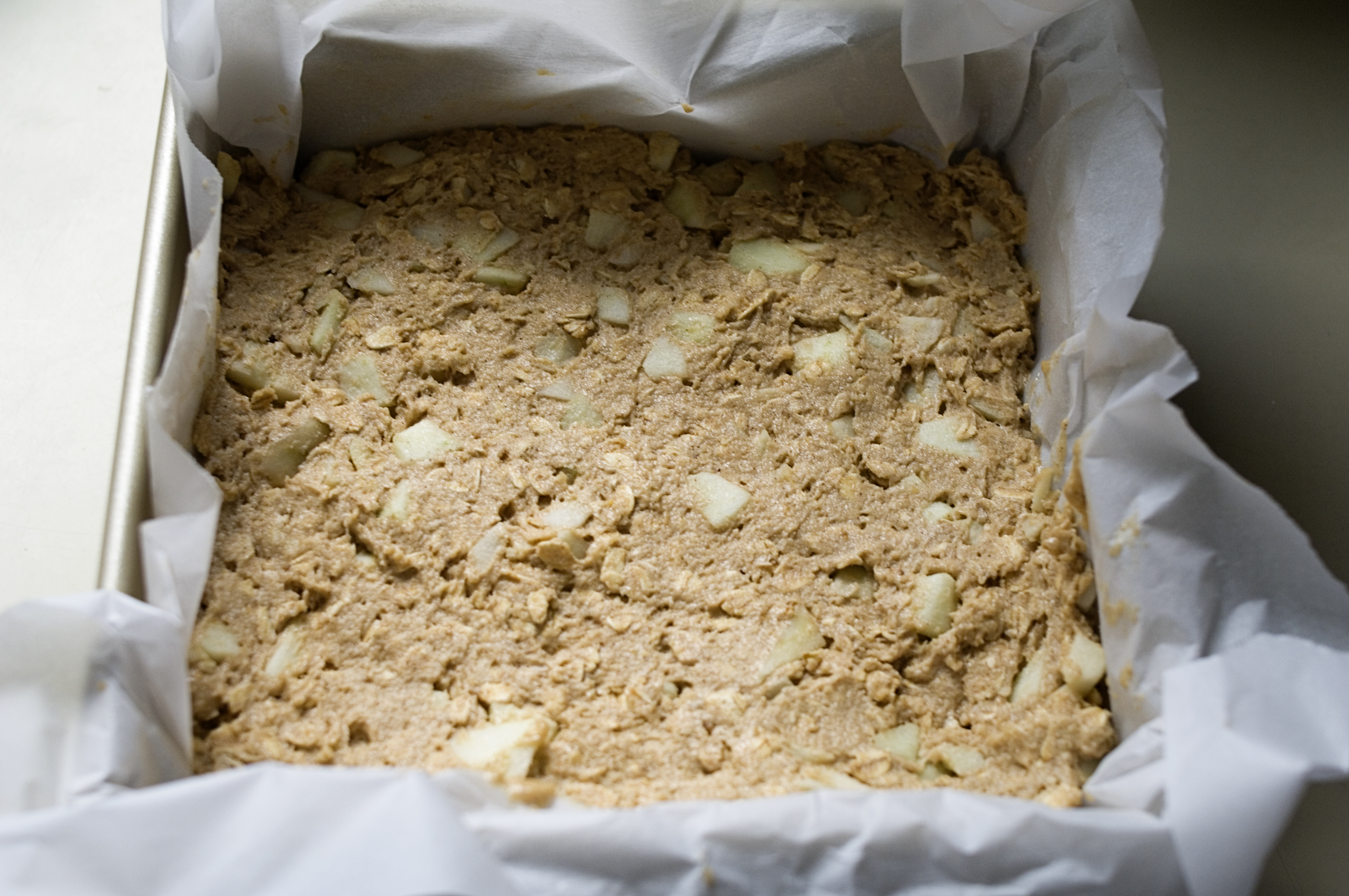 Reduce the speed to low and mix in the flour/oat mixture until just combined. Stir in the apple chunks. Pour batter into prepared pan and bake for 25-30 minutes. Be sure to check the bars starting at 20 minutes. You don’t wan to over bake!