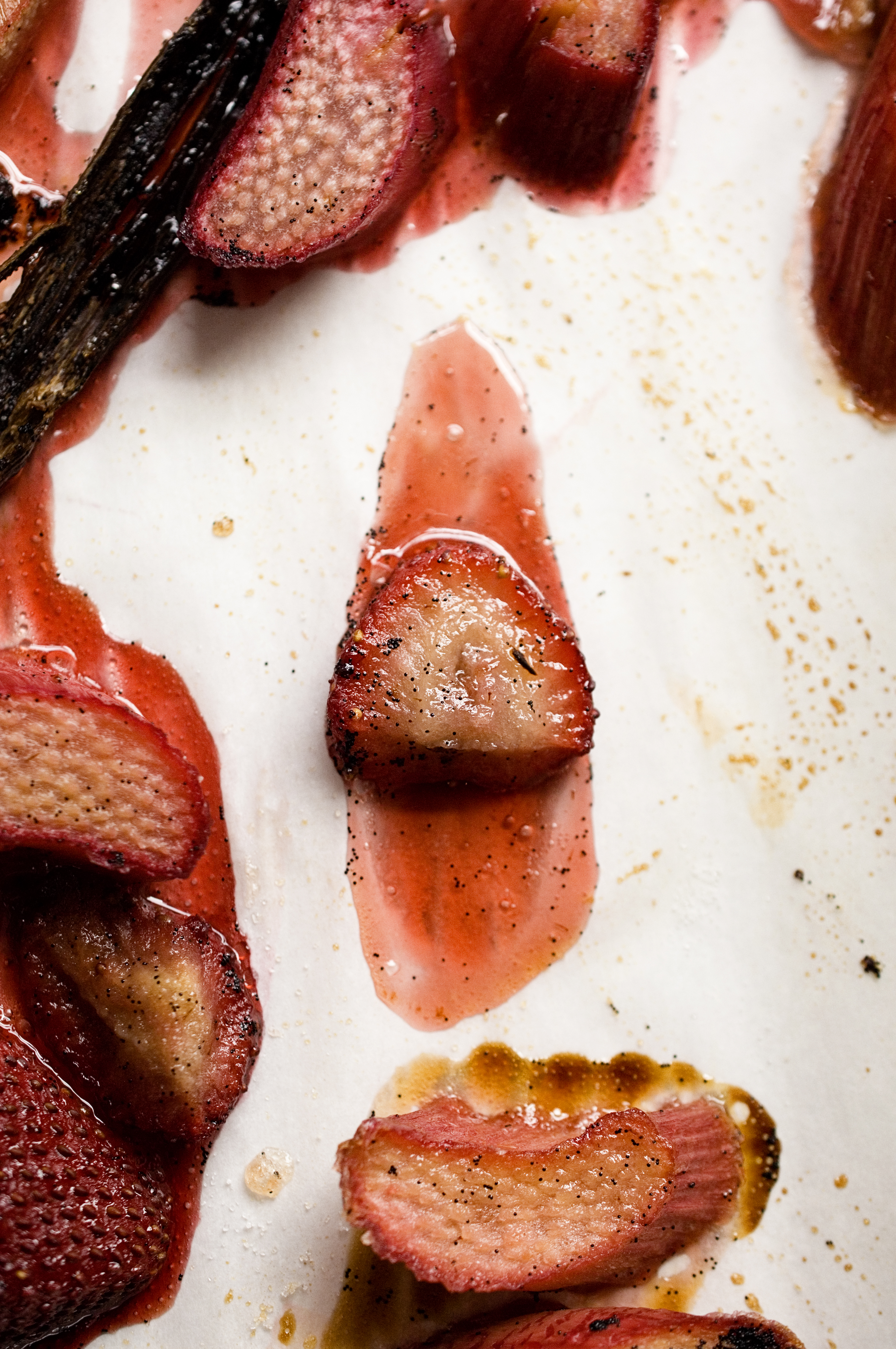 I sliced the strawberries and rhubarb and tossed them with a little sugar and seeds from one vanilla bean. I roasted them at 375 for about 30 minutes. Tossing the fruit with sugar helps to release some of its juices. Roasting the fruit brings out their natural sweetness and adds depth of flavor. Also, you can really taste the fresh vanilla bean in the fruit. So good!
