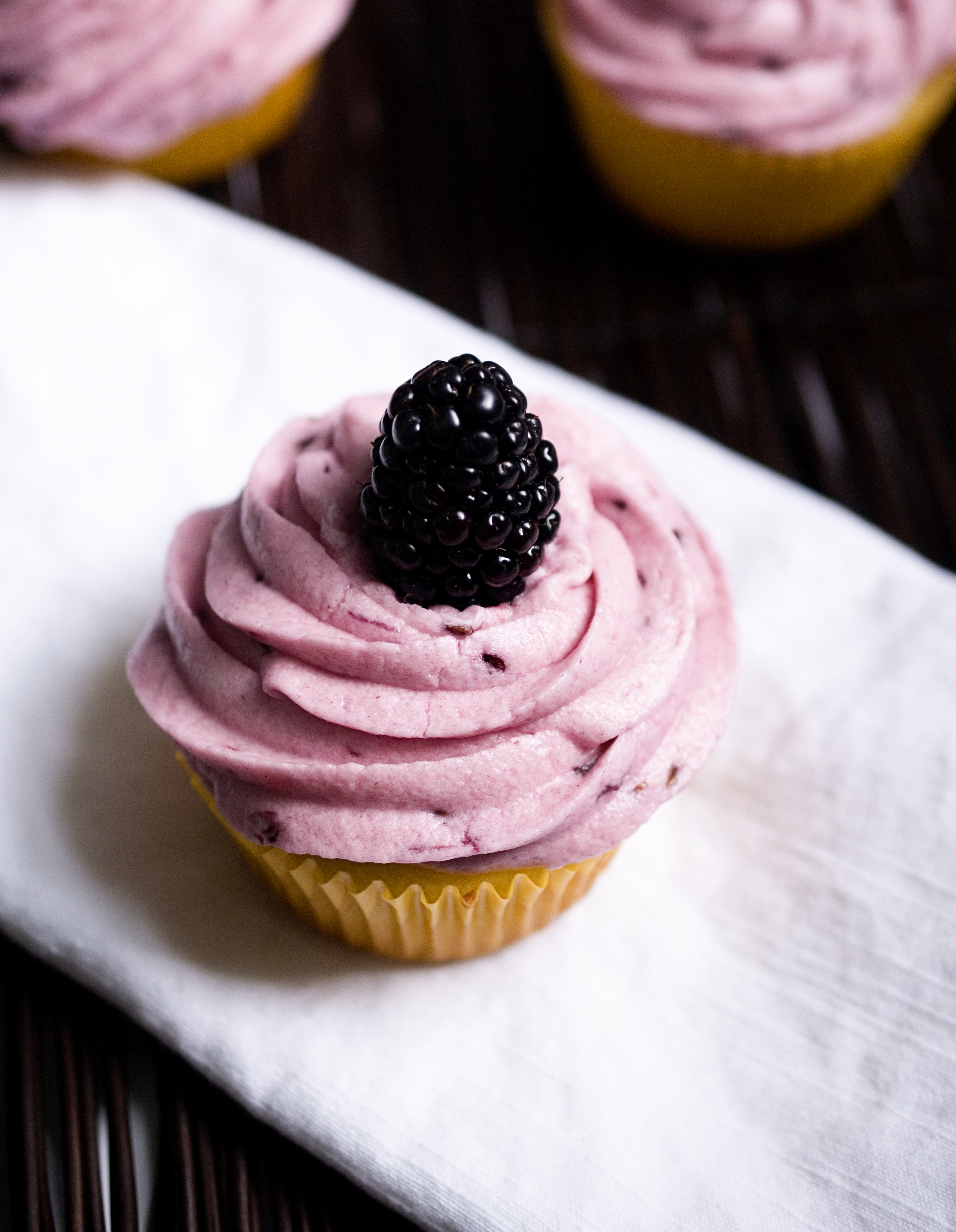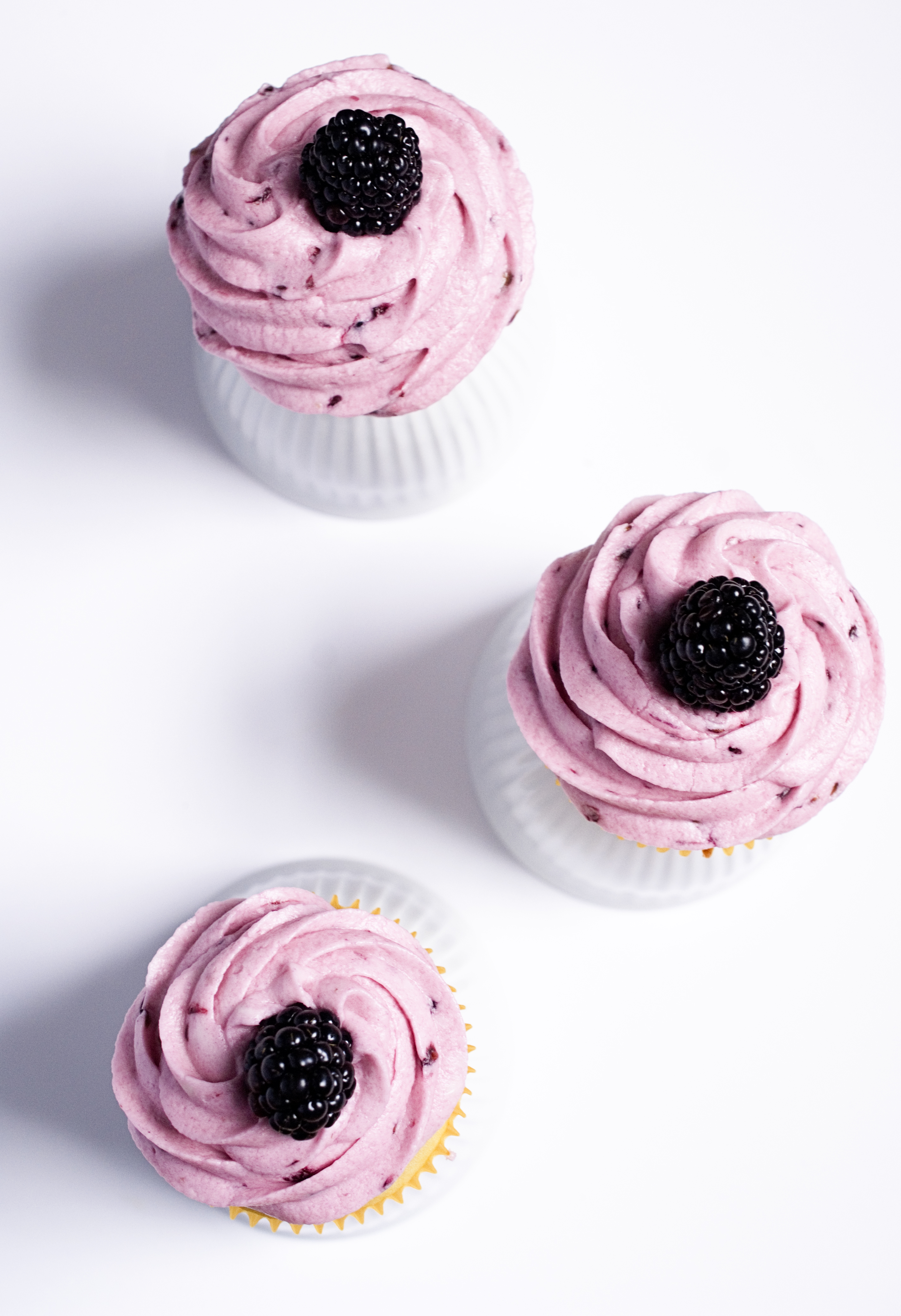 Pipe or spread frosting on each cupcake and add a blackberry for garnish. Enjoy!
