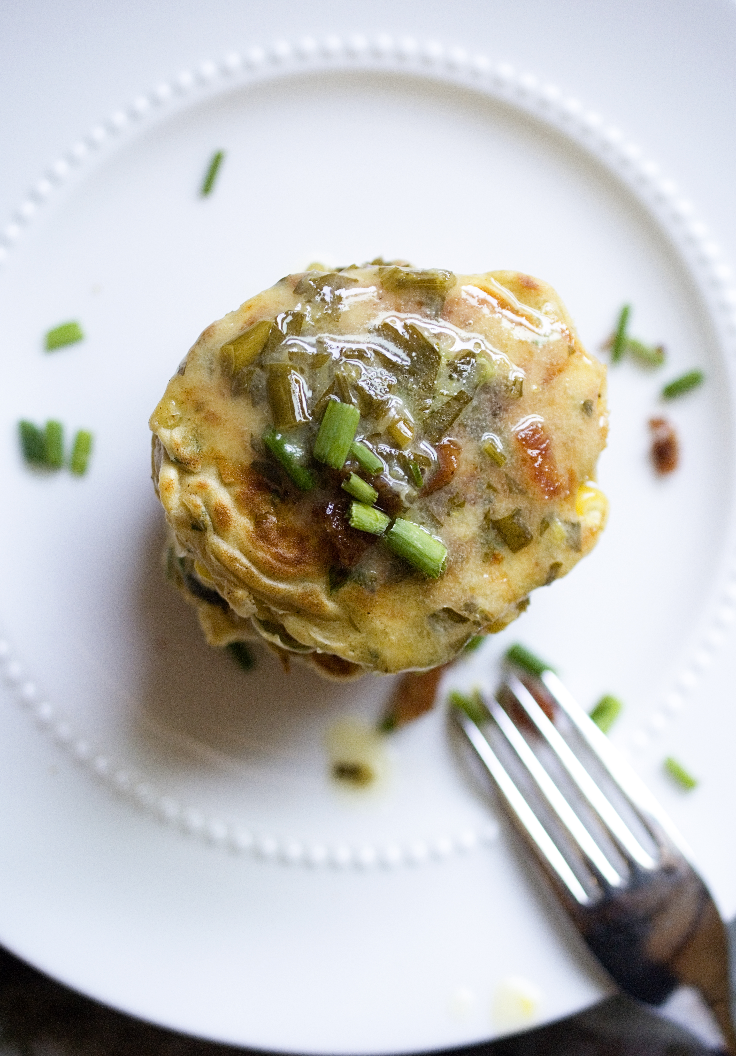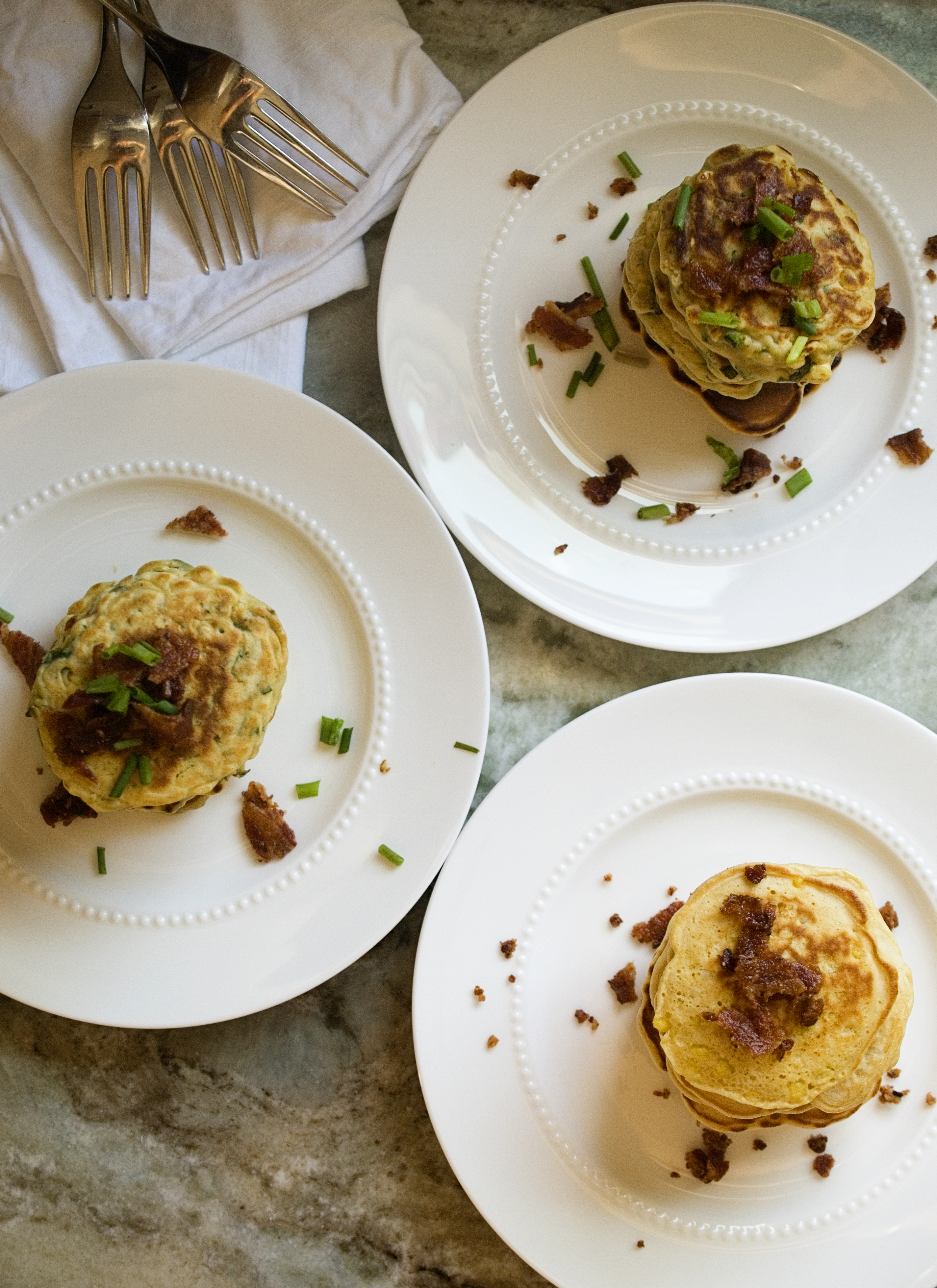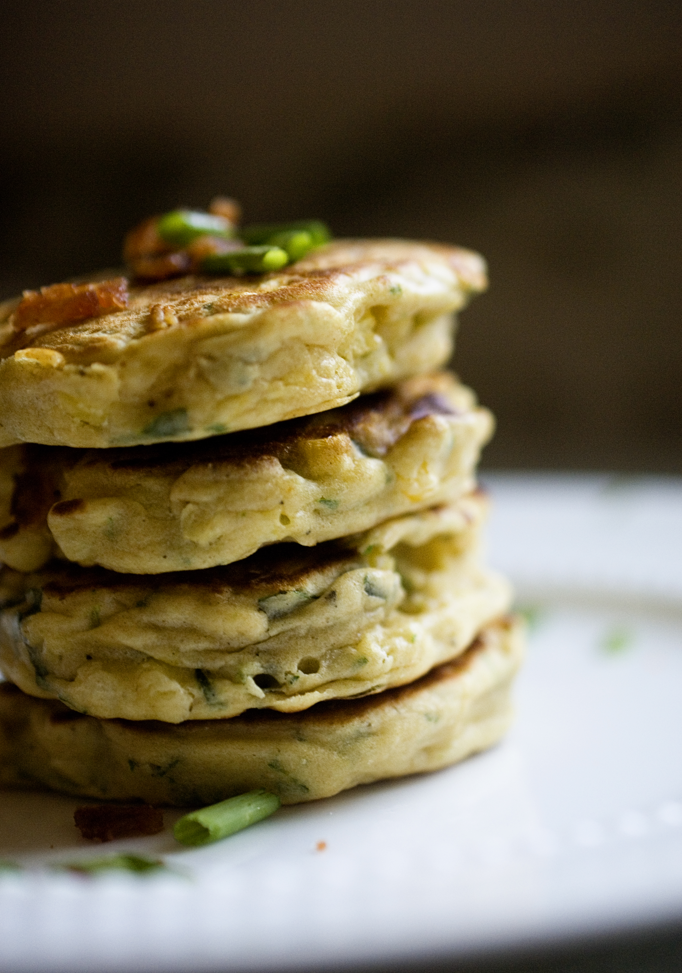 When I got home I looked up her recipe and found both a sweet and savory version of a corn fritter. Savory sounds interesting. Oh, and instead of a deep-fried treat, she prepared them as you would a pancake. Perfect! I feel less guilty about serving them to my family for dinner. I adapted her recipe by swapping out some of the flour for whole wheat flour, and using 1% milk instead of half and half. I felt like I made a healthy choice. Then I added bacon. Why? Because it was sitting in the fridge and it felt left out. You don’t need to add it, but it tastes dam good with corn and syrup. Just sayin’.