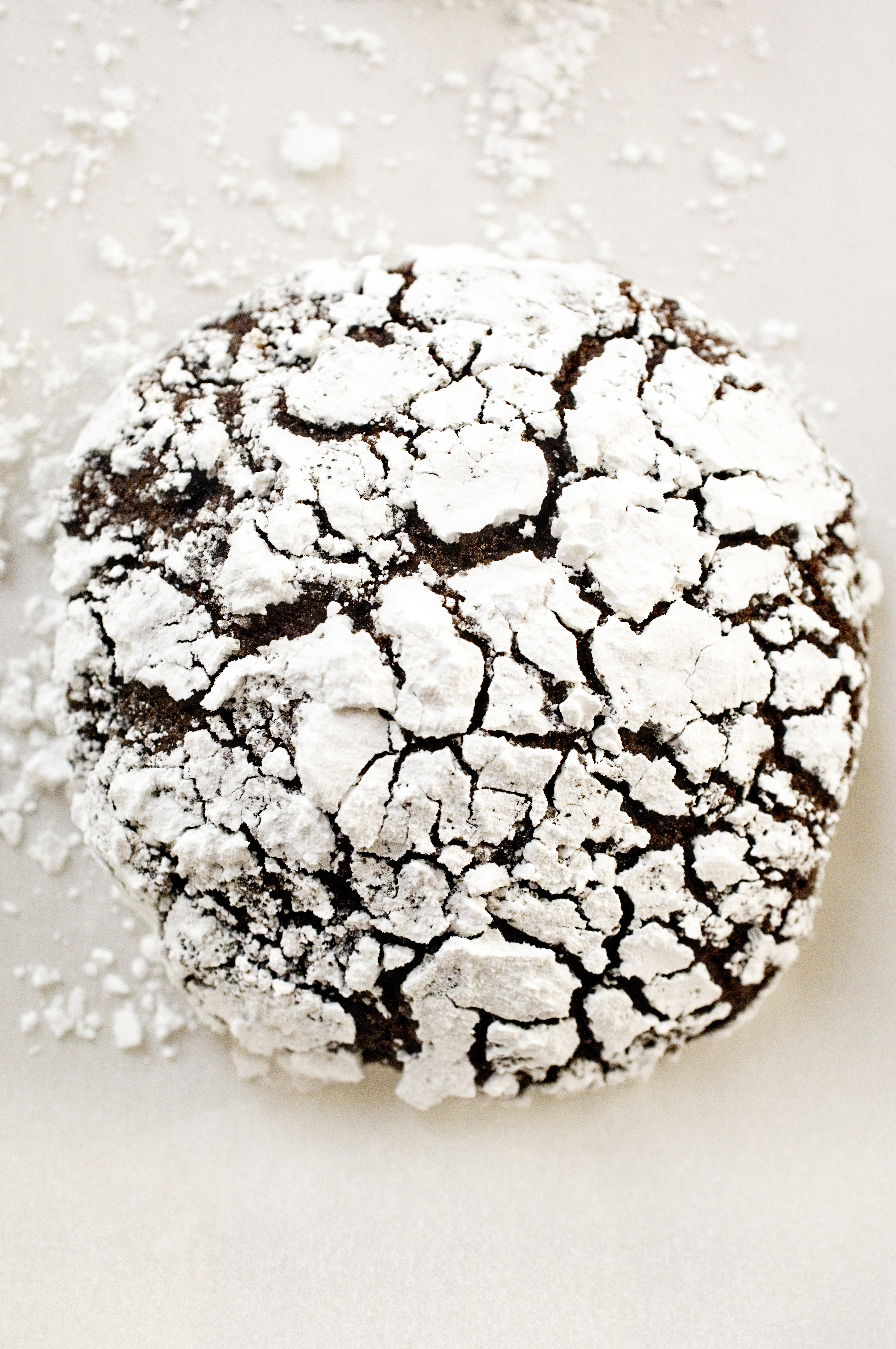 The thing that excites me most about these cookies are the tiny powder sugar-coated fissures covering the surface.  Turns out it is all about science. Imagine that!  To learn more about the science behind crinkly cookies head here.  Enjoy the day they are made with a cold glass of milk!