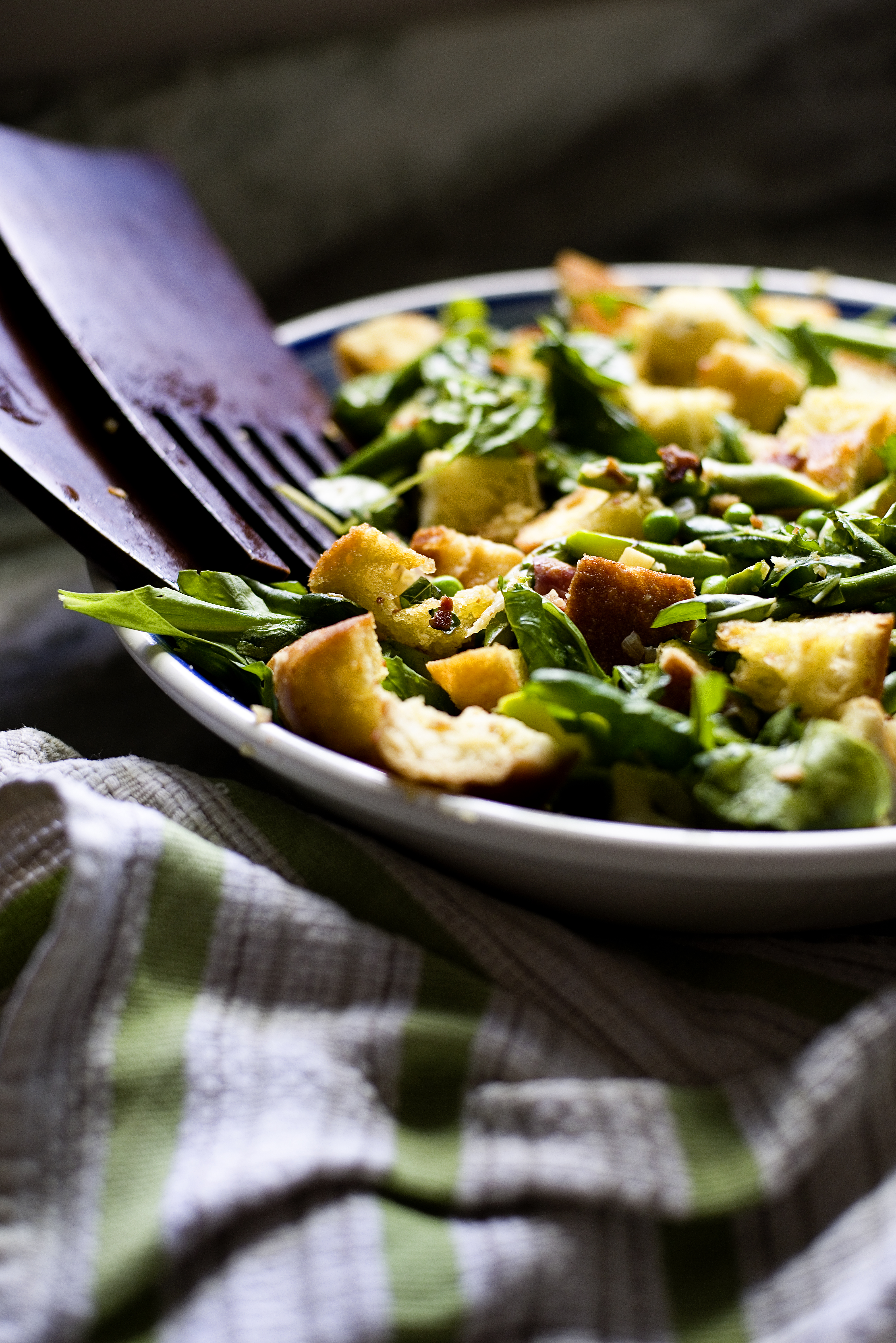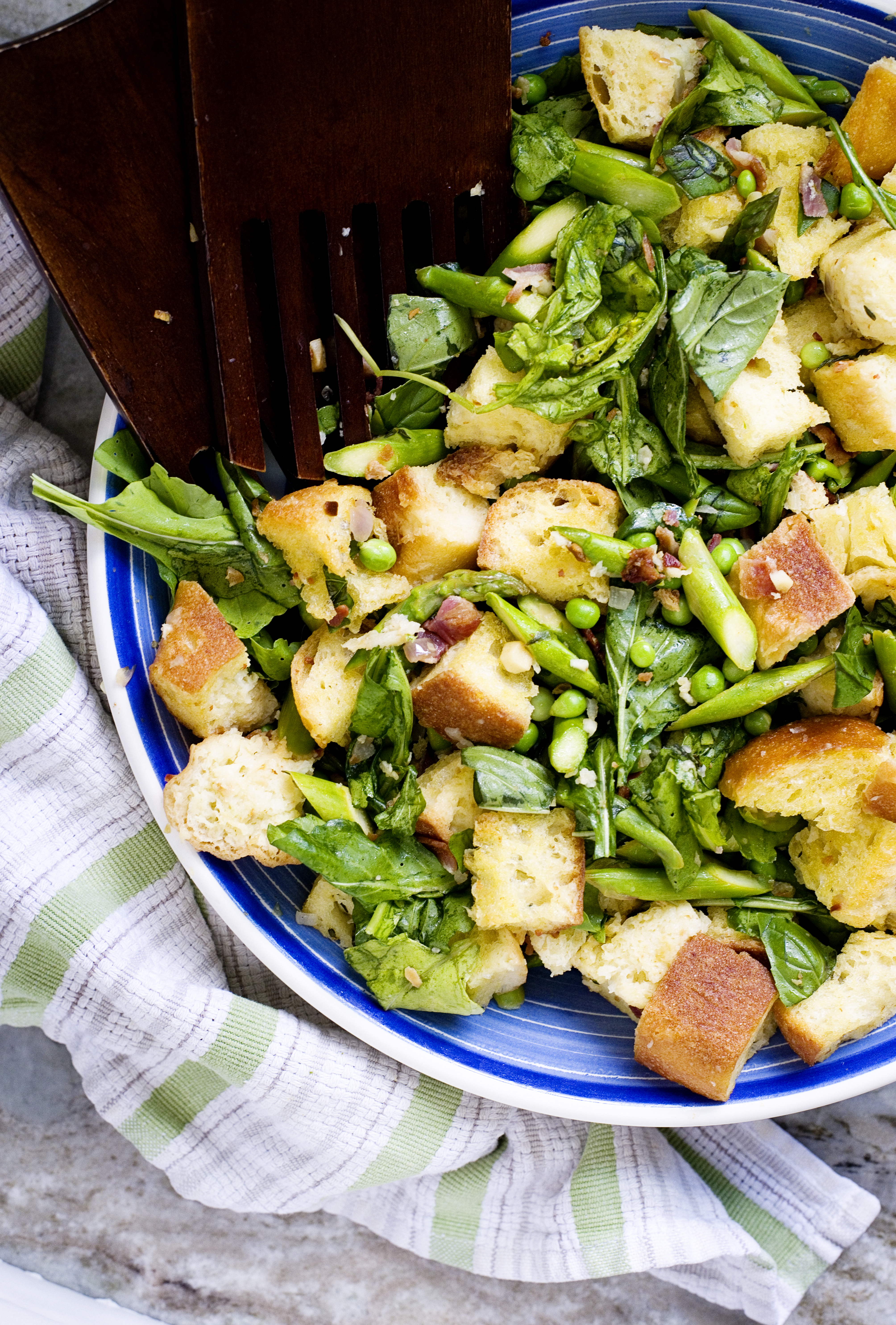 The peas, asparagus and arugula harmoniously come together with the pancetta. Chunks of hearty, toasted bread soak up the flavors of the garlic, shallot and thyme. A few good squeezes of fresh lemon juice, a generous sprinkling of sea salt and basil make this the kind of salad you eat and share all season long.